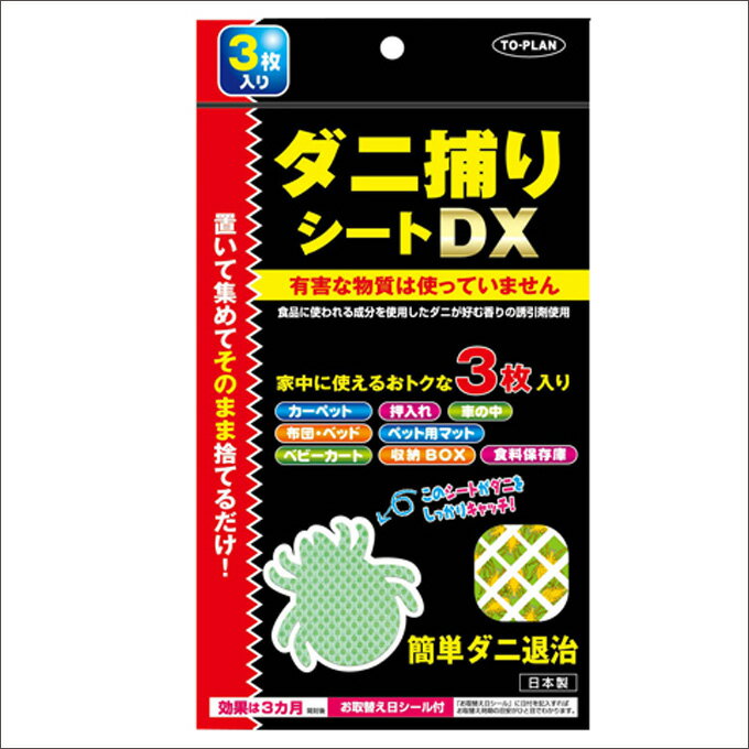 置くだけ簡単♪効果バツグン!安心・安全の日本製 【メール便80円?】※代引き不可※トプラン ダニ捕りシートDX(3枚入)【だに 取り マット 東京企画】 商品詳細 ダニ捕りシート DX 3枚入り (型番:TKR-16 / JANコード:4949176053952) お部屋に置くだけでダニを集めて一網打尽!! ■特徴 ・ダニ捕りシートは、食品に使われる成分を使用したダニが好む香りの誘引剤を使用しています。特殊な誘引剤に誘われたダニがシートの中に入り、強力粘着剤にひっついて死滅するという全く新しい方式です。これによりダニアレルゲンが飛散しません。 ・誘引剤に誘われてメッシュを通り抜けたダニは粘着シートがキャッチして逃がしません。 ・化学物質などの成分を含んだ従来のスプレー殺虫剤やくん煙殺虫剤とは違いシートを置くだけでダニの脱皮殻や死がい等を安全キャッチして処理することができます。 ・カーペット、押入れ、車の中、布団、ベッド、ペット用マット、ベビーカート、収納BOX、食料保存庫などに。 ・家中に使えるオトクな3枚入り! ・気になるところに置いて集まったダニをシートごと捨てるだけ。置くだけでダニを集めて捕獲でき、ご使用後も家庭用のゴミとしてそのまま捨てていただけます。 ・有害な物質は使ってません! ・「お取替え日シール」付きで、使用時に記入しておくとお取替え日が分かり便利です。 ※1枚あたりの効果面積:畳1?2帖程が目安です。 ■サイズ:W×D×H(mm) 約140×8.5×250 ■重量:約38g ■素材 生地:ポリエステル 誘引剤:不織布・天然フルーツエキス・シリカゲル・香料 粘着剤:強粘着シート ■有効期間:約3ヶ月 ■注意 ・水に濡れないようにして下さい。 ・誘引剤は安全なものですが皮膚に付いたり目や口に付いた場合は水で洗い流して下さい。(シートを叩いたり振ったりしないで下さい。) ・ご使用中お身体に異常が見られた場合、すぐに使用を中止して下さい。 ・お子様の手の届かないところに保管して下さい。 ・安全性を重視した誘引剤を使用して集めたダニをシーとごと捨てられることを特徴としていますが、化学物質を含むスプレー式殺虫剤などにみられる強力で短時間のダニ駆除効果と比べて比較的緩やかなダニ捕獲効果であり100%の駆除効果を保障するものではありません。 ・3カ月経過したら家庭用ゴミとして処理して下さい。 ★ダニ捕りシートDX シリーズ★ バラ売り1枚?価格340円【送料無料】 3枚セット(パッケージ商品)価格740円【メール便送料80円】 バラ売り10枚セット+おまけ1枚付価格2,750円【送料無料】 ※本商品は【代引き不可】商品です。予めご了承ください。 ※本商品は1個3枚入りです。 ※メール便送料 1個(3枚入り)、2個(6枚)、3個(9枚)は80円 4個(12枚)、5個(15枚)、6個(18枚)は160円 それ以上はお問い合わせください。