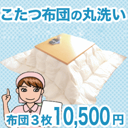 ご利用にあたっての注意事項 ●ご利用の前に必ず、洗える布団、洗えない布団の確認をお願いいたします。 (羽毛布団、こたつ布団、毛布、抱き枕、枕も同様に確認をお願いします。)●発送キットのお届け先と、仕上がった商品のお届け先は同じ住所でご注文をお願いします。●キットの集荷につきましては、お客さまのほうから、直接ヤマト運輸にご依頼をしてください。●発送準備にあたりまして、お布団に安全ピンで名札をとりつけていただきます。お怪我のないように、お気を付けて作業をしていただくよう、お願い申し上げます。●丸洗い後のお布団のお届けは、約2〜3週間後になります。(日時の指定は承れません。)●布団、枕の丸洗いと別商品を同時に注文された場合、キットとその他の商品は別送となり、同梱はお受けできません。また上記の条件で、お支払い方法に代金引換をお選びいただいた場合、キット以外の商品お届け時のお支払いとなります。健康は質の高い睡眠から…それも清潔なお布団や枕で眠る幸せは、本当に格別なものです。でも、大きくて重くてかさばるお布団、衣類やタオルを洗うように、ご家庭で簡単にお洗濯することはできませんよね。専門のクリーニング店まで運ぶ手間も一苦労ですし、そもそもお布団が洗えるのかどうか、ご存じない方も多いかもしれません。そこで、「キレイなお布団で眠りたい」、そんな誰もが思うささやかな想いに、「フレスコeパック」がお応えします!「フレスコeパック」は、専用の宅配袋に布団を詰めていただくでOK。あとは、プロの技術でキレイにお洗濯された、お布団の到着を待つだけ。お家に居ながらにしてお布団をクリーニングに出せる「完全宅配サービス」なので、お布団の丸洗いがとっても身近になりました。毎日わたしたちが使っているお布団。寝ている間には、お布団の中わたは、どんどん汚れが蓄積されています。ドライクリーニングでは見た目の汚れはとれたように見えるかもしれませんが、フケ・アカ・ダニなどの水溶性の汚れ自体は落とせていないのです。布団に蓄積しているフケ・アカ・ダニなどの汚れは水溶性のもの、つまり水に溶ける汚れなので、定期的に水洗いすることで、キレイにすることができるのです。逆に言うと、お布団を天日干ししたり、たたいたりしても、アレルゲンを完全に除去することはできません。掃除機などで吸っても、ふとん表面の一部のアレルゲンしか除去できないのです。そう、お布団の中綿までしっかりとキレイにできるのは、お布団の丸洗いだけなのです。フレスコeパックは、丸洗い専用の洗濯機、洗剤、 洗浄プログラム、 乾燥機をトータルシステムとして自社開発。中わたを保護しつつ完全に洗浄し、また回復させる技術を蓄積しているので、仕上がり品質にも自信があります。さらに、ネットで簡単申込、発送はお布団を専用の宅配袋に詰めて出していただくだけ。お布団の丸洗いが、さらに身近に・便利になりました。お申し込みの前に、丸洗いできるかご確認をお願いします。洗える布団・洗えない布団がありますので、ご利用まえに下記をご覧いただきご確認をお願いします。洗える布団の一覧に入っていない素材は基本的には洗えません。商品概要商品名 こたつ布団クリーニング・丸洗い(フレスコeパック) 3枚用内 容 こたつ布団 3枚※宅配用ふとん袋に入るサイズなら正方形・長方形などサイズは問いません。宅配用ふとん袋のサイズ (約)縦65×横100×高さ40cmコース 通常コース工 場 株式会社フレスコ指定工場※ご購入前に「布団クリーニングのよくある質問集」をご確認ください。個人情報の取り扱いにつきましてお預かりした個人情報につきましては、発送・問い合わせ・アフターサポート業務のため、提携するクリーニング専門業者(株式会社フレスコ)に提供させていただいております。あらかじめご了承くださいますよう、お願い申し上げます。