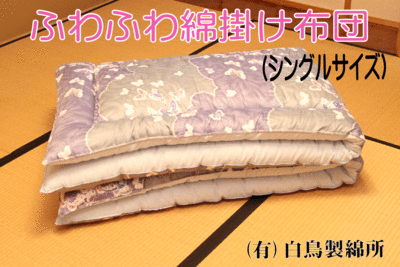 【商品詳細】■サイズ150×200cm(シングルサイズ)■側生地綿100%(サテン生地)■中綿メキシコ綿(米綿)70% ポリエステル30%■中綿重量約3kg■商品特徴・キルティング加工・4隅カバーずれ防止ループ付き。■備考受注生産品につきお届けまで1週間?10日程かかります。■注意ご使用のモニターによっては商品写真と実際の色見が異なる場合もございます。※送料無料ですが、沖縄、離島のお客さまは別途追加料金が発生します。注文受付後当店からお送りする送料をご確認ください。綿布団は吸湿性・保温性が良く自然の植物繊維ですので体に優しく肌にも刺激がすくないです。自社工場で縫製・製綿・仕立てまで職人が一枚一枚お作りいたします。 東京西川のサテン生地をはじめ、色・柄豊富に取り扱っております。 掛け布団には、繊維が細くて長く軟らかなメキシコ綿(米綿)。敷き布団には繊維が太く弾力性がある。インド綿を使用しています。 かさ高性・弾力性をアップさせヘタリにくくするためにポリエステル綿を30%混合させております ひとつひとつ心を込めて職人がご要望に合わせてお仕立ていたします。 掛け布団は綿ズレ防止の為、キルティング加工をいたします。 商品使用上の注意(お手入れ法) 綿布団のお手入れ法 綿布団は吸湿性に優れているものの取り込んだ水分を自然に発散させることがなかなか出来ません。湿気をそのままにしておくとカビやダニの発生率も高くなります。そこで一番のお手入れ法は天日干しです。湿気を除き、殺菌効果もあります。湿気は下にも浸透しますので表裏1時間ずつ天日干しさせてください。これ以上長くしますと生地を傷めてしまう危険性があるので長時間の天日干しは禁物です。日差しの強い夏は午前中に干すことをお勧めします。雨が降って天日干しができない場合は除湿機などをかけて椅子や台などに布団をかけておくだけでもかなり湿気を飛ばせます。 ☆天日干しで死んだダニ・埃などを取り除く方法 みなさんすぐに思いつくのは布団たたきですがそれは布団によくありません。生地を傷め、中の綿も切れてしまい布団の寿命が短くなってしまいます。そこで布団を傷めず、埃、ダニを取り除く方法として掃除機をかけると良いでしょう。布団専用ノズルを使えば布を吸い込むことなくダニ・埃を効率良く取り除くことができます。長期間(目安としては掛け布団 約5年、敷き布団 約3年)使用し、硬く布団を干しても、ふわっとしなくなってしまった場合は打ち直しすることも可能です。 西川生地 蝶 青 蝶 赤 花 青 花 赤 三馬生地 洋 青 洋 赤 花 青 花 赤